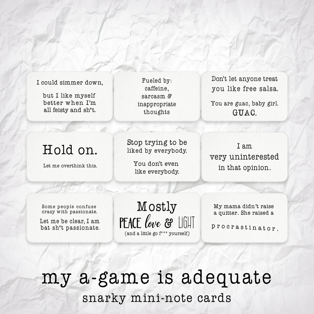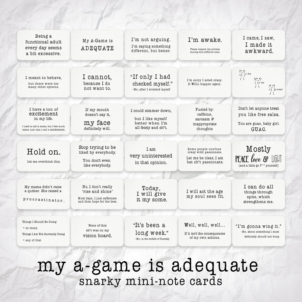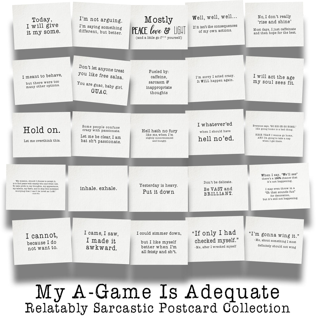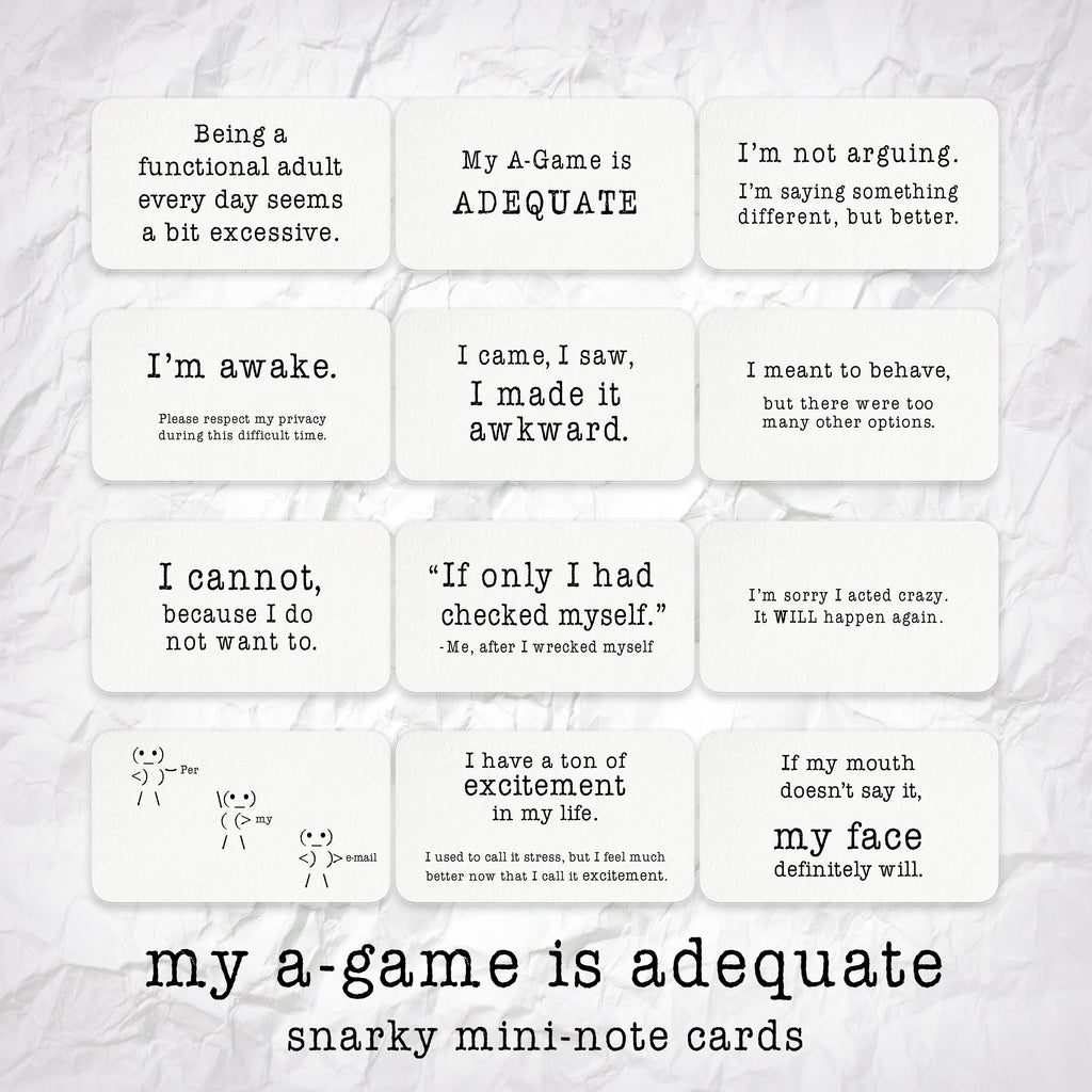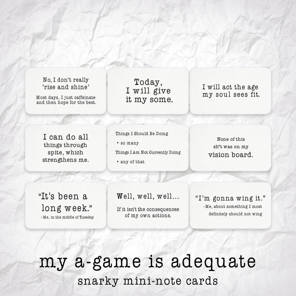 / My A-Game is Adequate Snarky Postcard & Mini-Note Card Bundle Set
